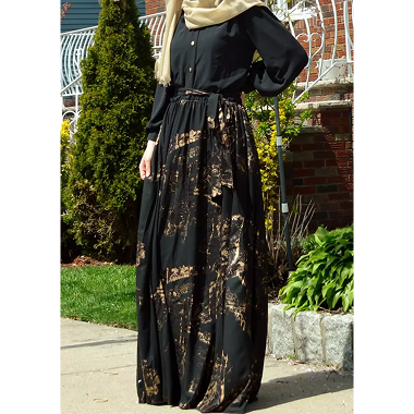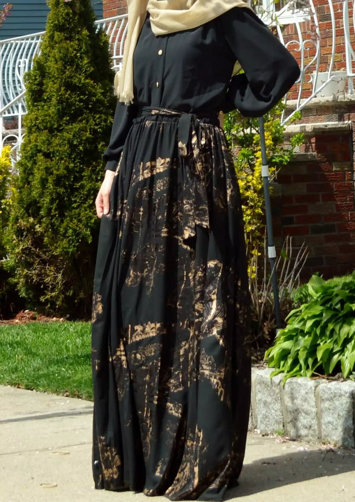 Elevate your style with our Annabelle Maxi Dress in Black. This gorgeous dress design offers a blend of timeless elegance with modern twists. Featuring a full maxi length and A-line silhouette, it’s crafted from beautiful exotic Korean silk and crepe georgette materials for a luxurious look and comfort. The full bodice buttons across the torso, allowing for several styling options, while the attached belt cinches the waistline for a flattering fit. Complete with bell sleeves and buttoned cuffs, this dress is perfect for parties or a night out on the town. Plus, it requires no ironing and is fully lined for non-see-through coverage.