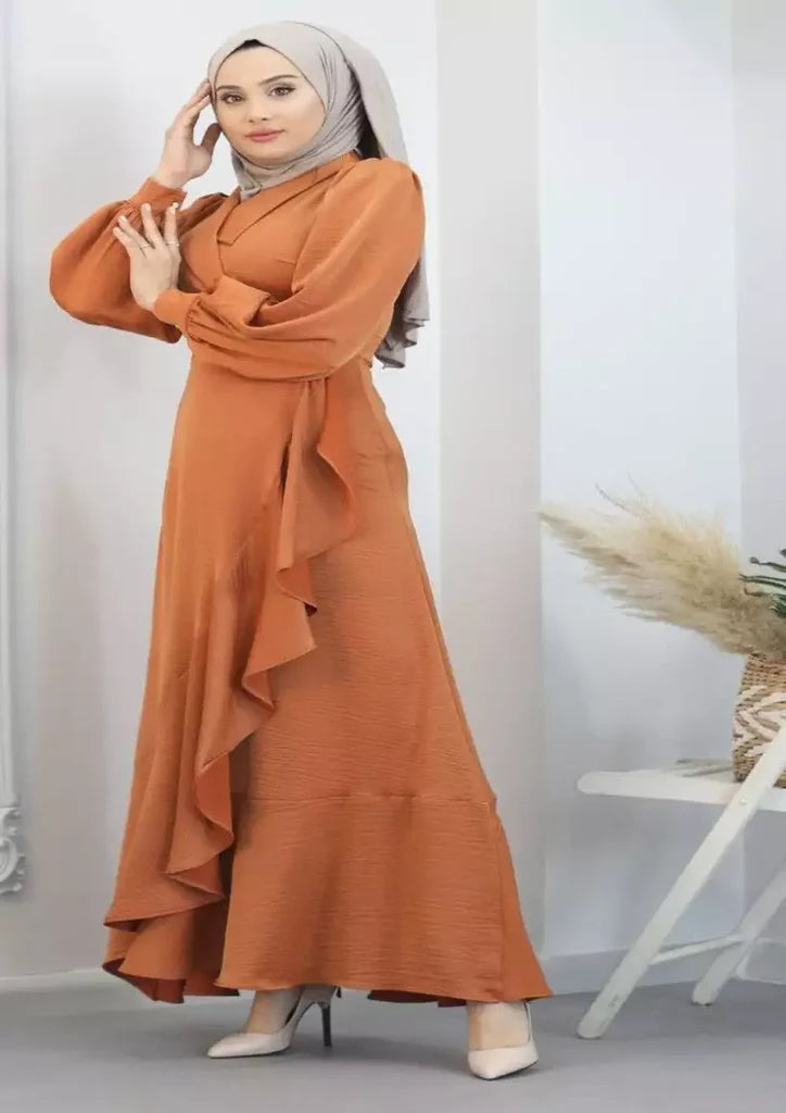 Evoke timeless elegance with our Classic Copper Silk Gown. Featuring an A-line silhouette and bell sleeves with oversized cuffs, this gown exudes sophistication. The crisscross collar gracefully flows to a beautiful skirt, enhanced with a charming flare and ruffle at one edge. Crafted from luxurious silk, it offers a maxi length, non-see-through fabric, and resistance to shrinkage. Elevate your evening attire with this exquisite piece.