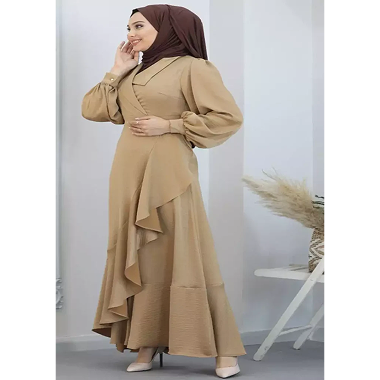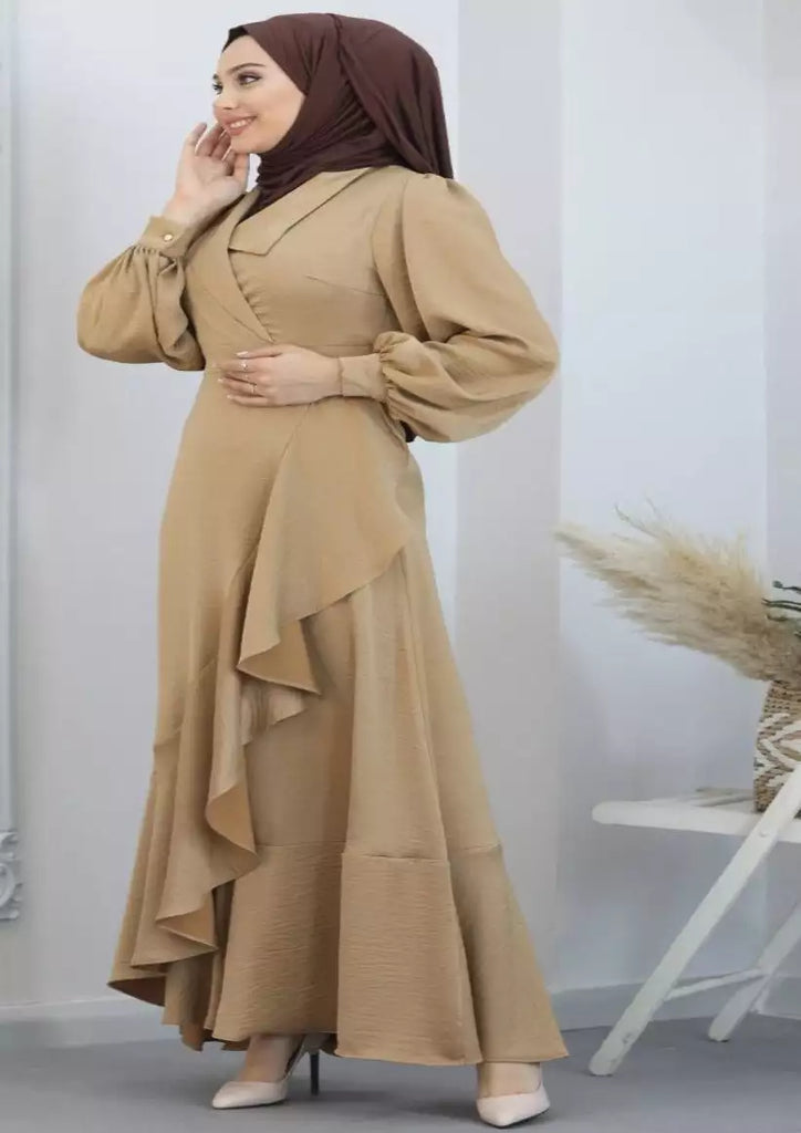 Elegance meets sophistication in our Classic Gold Silk Gown. Featuring a timeless A-line silhouette and bell sleeves with oversized cuffs, this gown exudes classic charm. The criss-cross collar adds a touch of allure, while the flowing skirt boasts a beautiful flare and ruffle detail at the edge. Crafted from luxurious silk, this maxi-length gown is non-see-through and resistant to shrinkage, ensuring timeless beauty and durability.