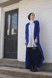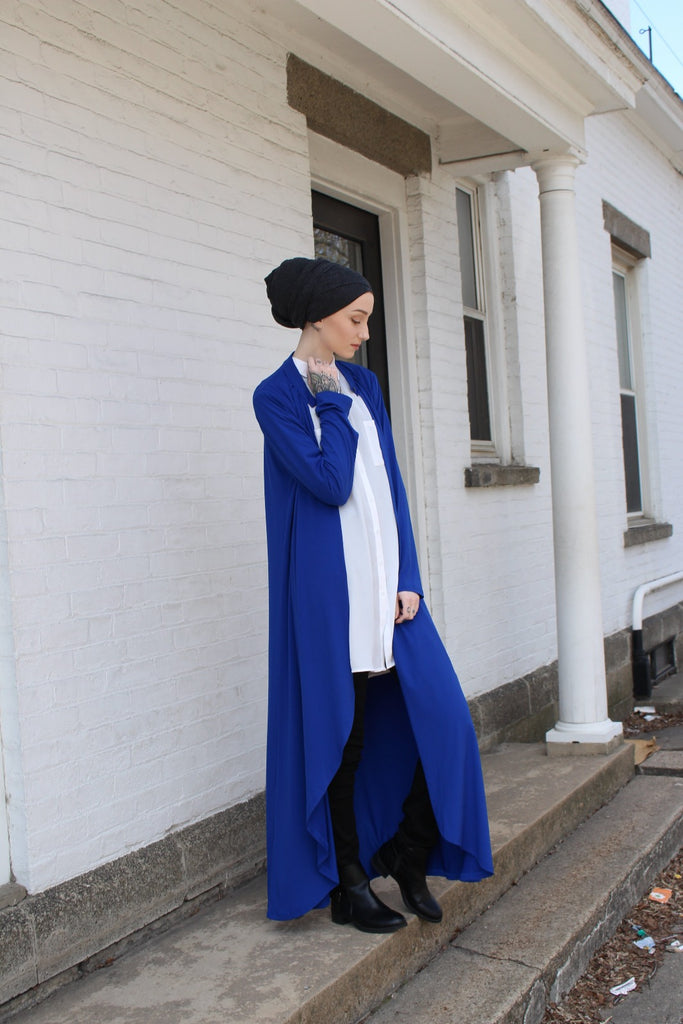 Elegant floor-length waterfall cardigan with one-button closure. Perfect modest layering piece for dresses & outfits. High-quality, wrinkle-free fabric.